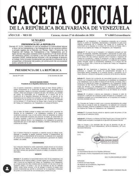 “Se establece la inmovilidad laboral a favor de los trabajadores y las trabajadoras de los sectores público y privado regidos por el decreto con rango, valor y fuerza de ley Orgánica del Trabajo, los trabajadores y las trabajadoras, por el lapso de dos (02) años contados entre el primero (1°) de enero de dos mil veinticinco (2025) y el treinta y uno (31) de diciembre de dos mil veintiséis (2026) ambas fechas inclusive a fin de proteger el derecho al trabajo como proceso fundamental que permite la promoción de la prosperidad, el bienestar del pueblo y la construcción de una sociedad justa y amante de la paz”, reza el decreto.